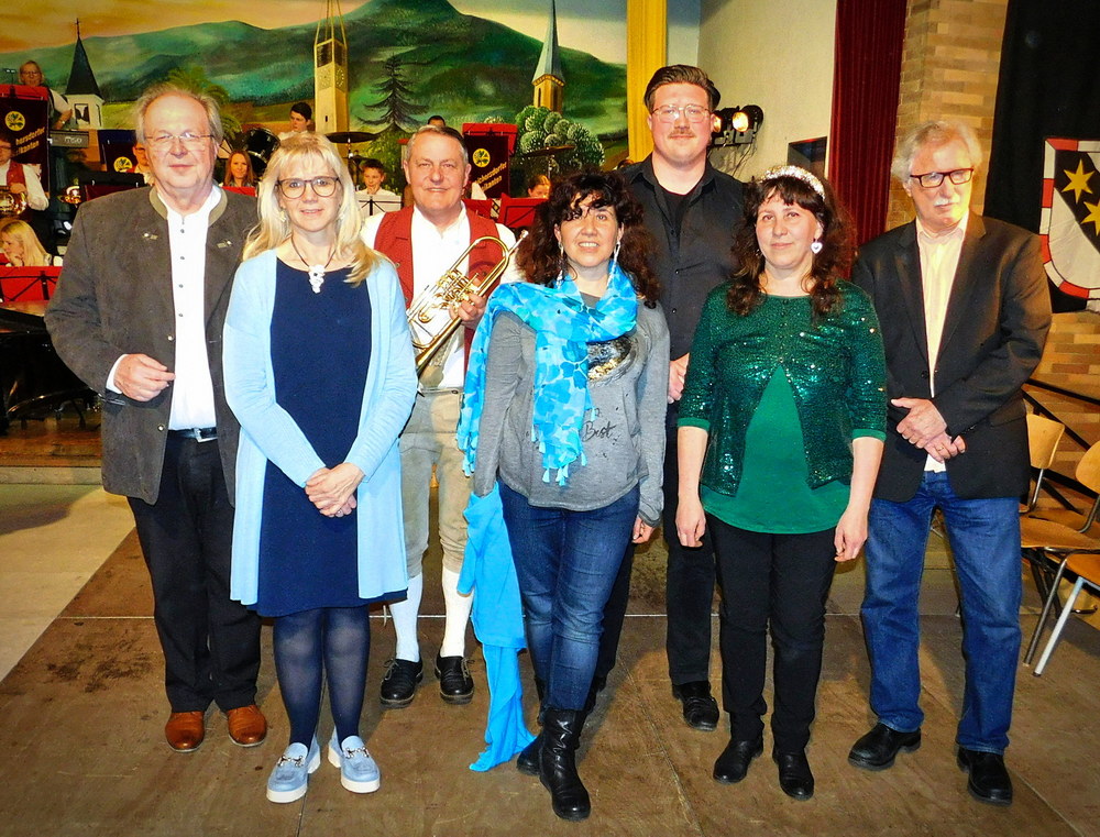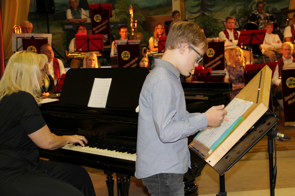 Diese ganze Bandbreite des künstlerischen Niveaus und der Instrumentenpalette wurde dem Publikum dann auch drei Stunden lang im Hauptkonzert präsentiert. Als „Special“, wie es Heinz Schmidt formulierte, gab Max Schmeißner, der mit seinem Down-syndrom Veeh-Harfe lernt, zum Auftakt des Solo- und Ensembleprogramms sein Debüt. Begleitet von Musikpädagogin Lucia Stelzer spielte er auf dem Saiteninstrument die Filmmelodie „Probier‘s mal mit Gemütlichkeit“ und das Kinderlied „Das grüne Krokodil“. Bevor er in die Saiten griff, sangen seine beiden Schwestern Ida und Jule und seine beiden Freundinnen Lotta Veigl und Amelie Veigl beide Lieder im Quartett. Wie Lucia Stelzer ihren Zuhörerinnen erläuterte, habe ein Herr Veh für sein Kind mit Down-Syndrom dieses Instrument entwickelt, da diese von der Fingerfertigkeit hier nicht die Möglichkeit haben, ein anderes Instrument zu lernen und zu spielen. Die Veeh-Harfe sei hierfür optimal, da man diese nur mit den Zeigefingern beider Hände spielen müsse. Zudem müsse man auch nicht Noten lesen können. Sondern der Weg werde in Form von schwarzen Punkten gekennzeichnet, die man hinter die Tasten klebe. Dann müssten die Kinder diesen Weg praktisch nur mit den Fingern ablaufen. „Hauptsächlich wollen wir der Öffentlichkeit zeigen, dass auch Kinder mit kleinen und größeren Defiziten die Möglichkeit haben, ein Instrument zu lernen und einfach mit Musik sich selber zu öffnen“, erläuterte Stelzer mit einem dicken „Danke schön“ an Max Schmeißner. Das Publikum quittierte seine beiden Darbietungen mit donnerndem Applaus.